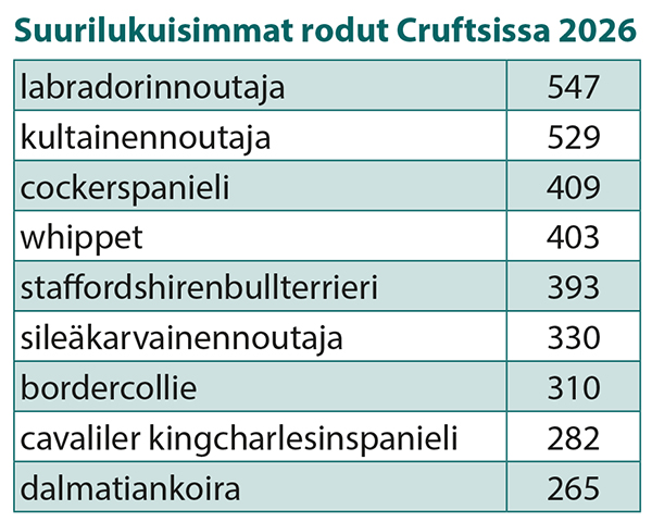 Hyviä osallistumismääriä esittävät myös Italia (436), Saksa (425) ja Hollanti (353). Suomalaiskoiria on ilmoitettu 54.